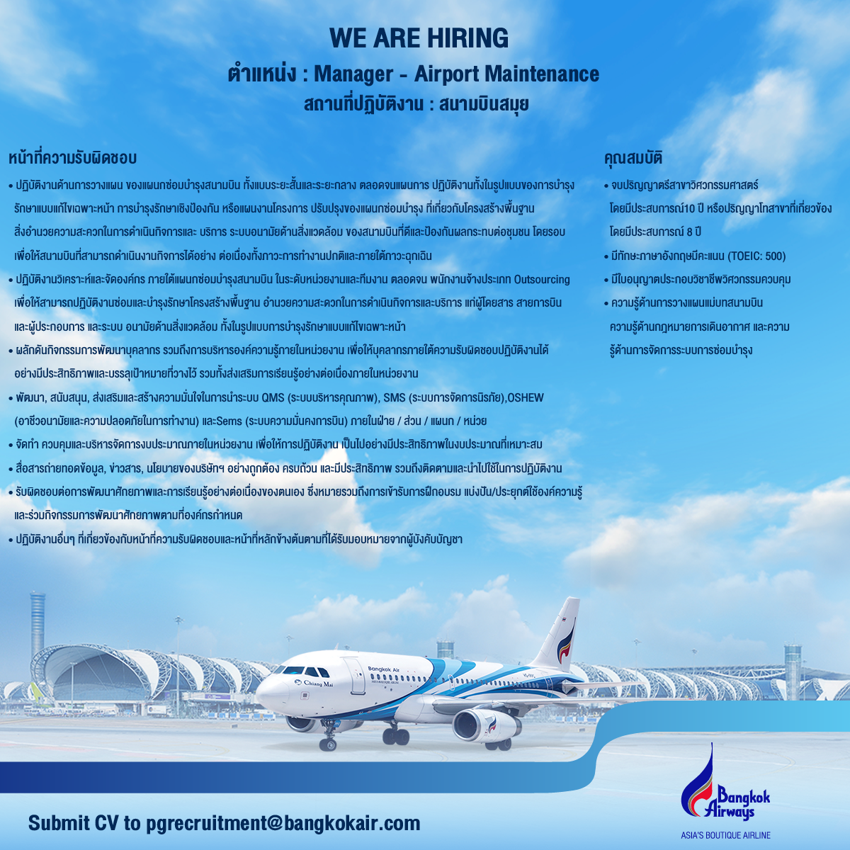 Bangkok Airways รับสมัคร Airport Maintenance Manager ขอ TOEIC 500+ ที่สมุย
