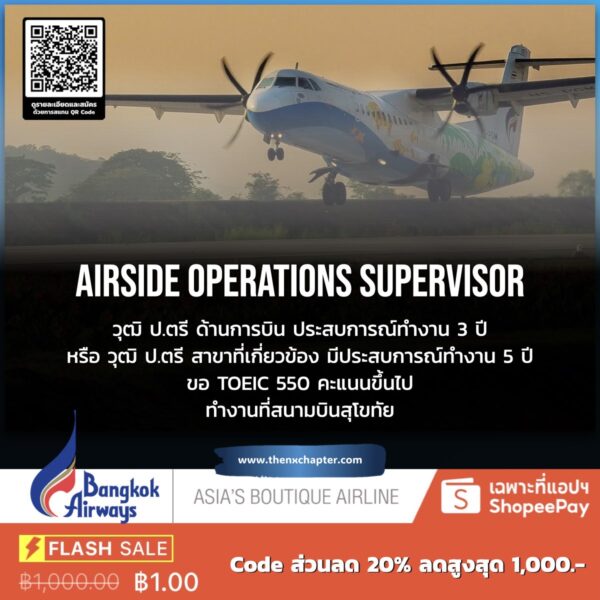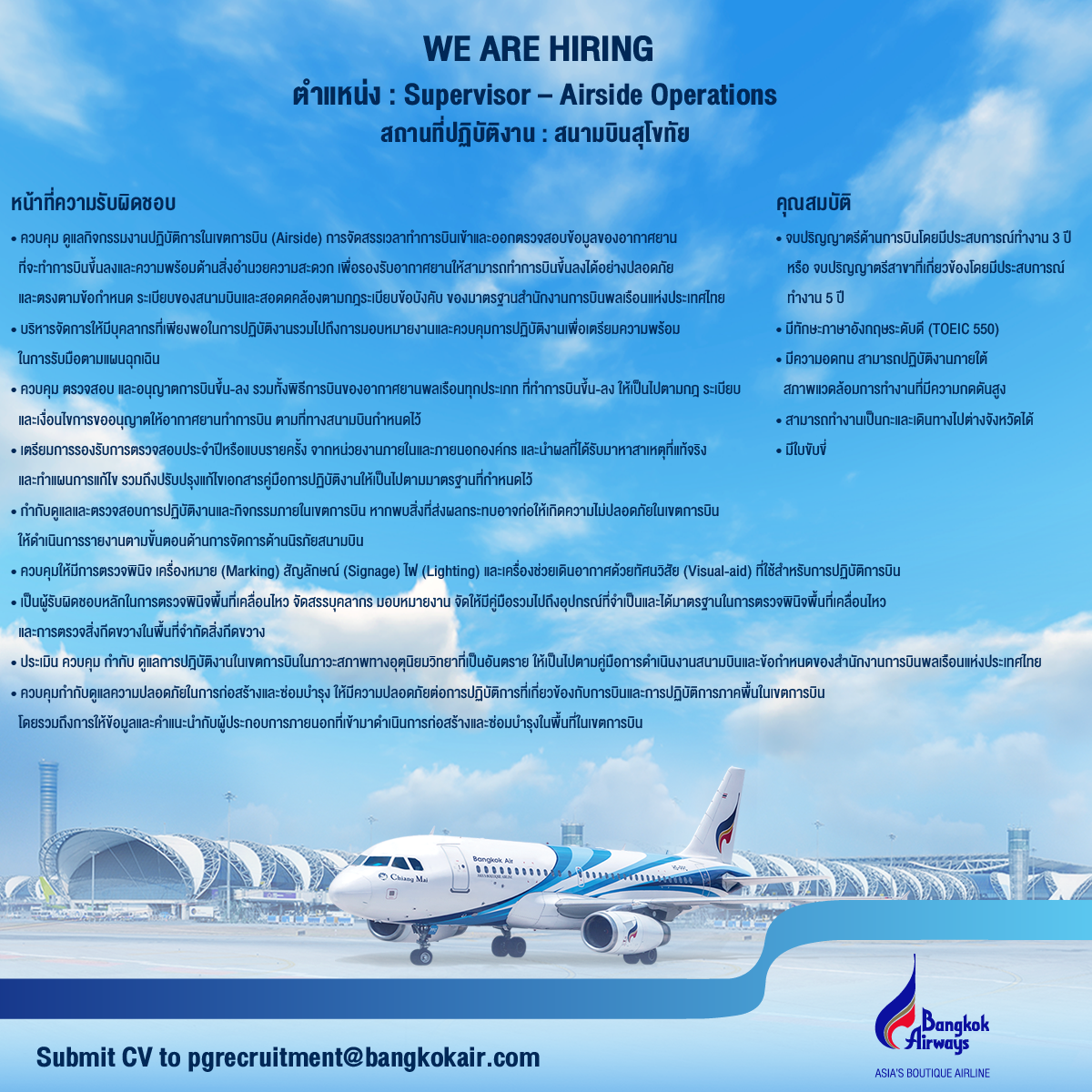 สายการบิน Bangkok Airways เปิดรับสมัครตำแหน่ง Airside Operations Supervisor วุฒิ ป.ตรี ด้านการบิน ประสบการณ์ทำงาน 3 ปี หรือ วุฒิ ป.ตรี สาขาที่เกี่ยวข้อง มีประสบการณ์ทำงาน 5 ปี ขอ TOEIC 550 คะแนนขึ้นไป ทำงานที่สนามบินสุโขทัย