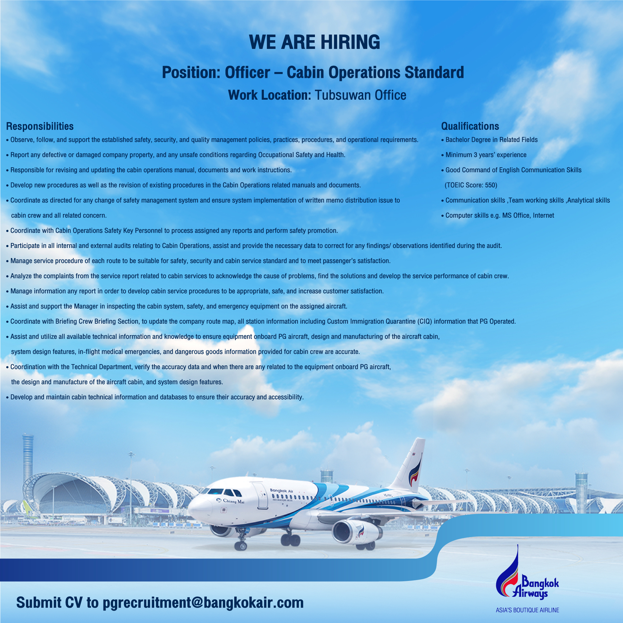 สายการบิน Bangkok Airways เปิดรับสมัครตำแหน่ง Cabin Operations Standard วุฒิ ป.ตรี ทุกสาขา มีประสบการณ์อย่างน้อย 3 ปี ขอ TOEIC 550 คะแนนขึ้นไป ทำงานที่อาคารทับสุวรรณ