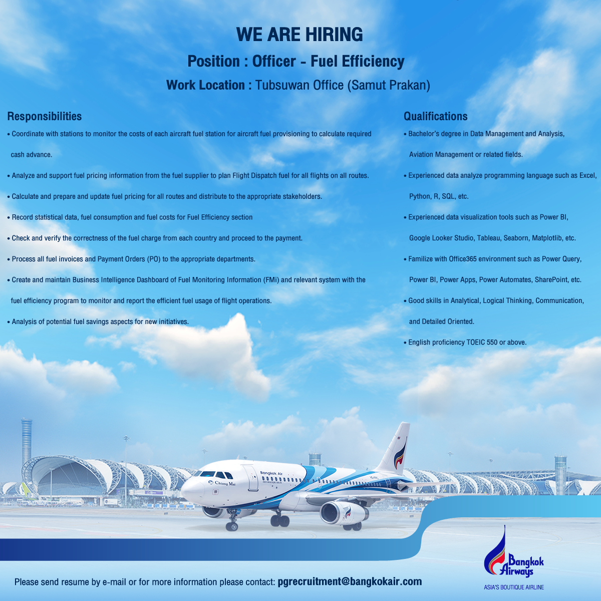 Bangkok Airways รับสมัคร Fuel Efficiency Officer ขอ TOEIC 550+ ที่อาคารทับสุวรรณ