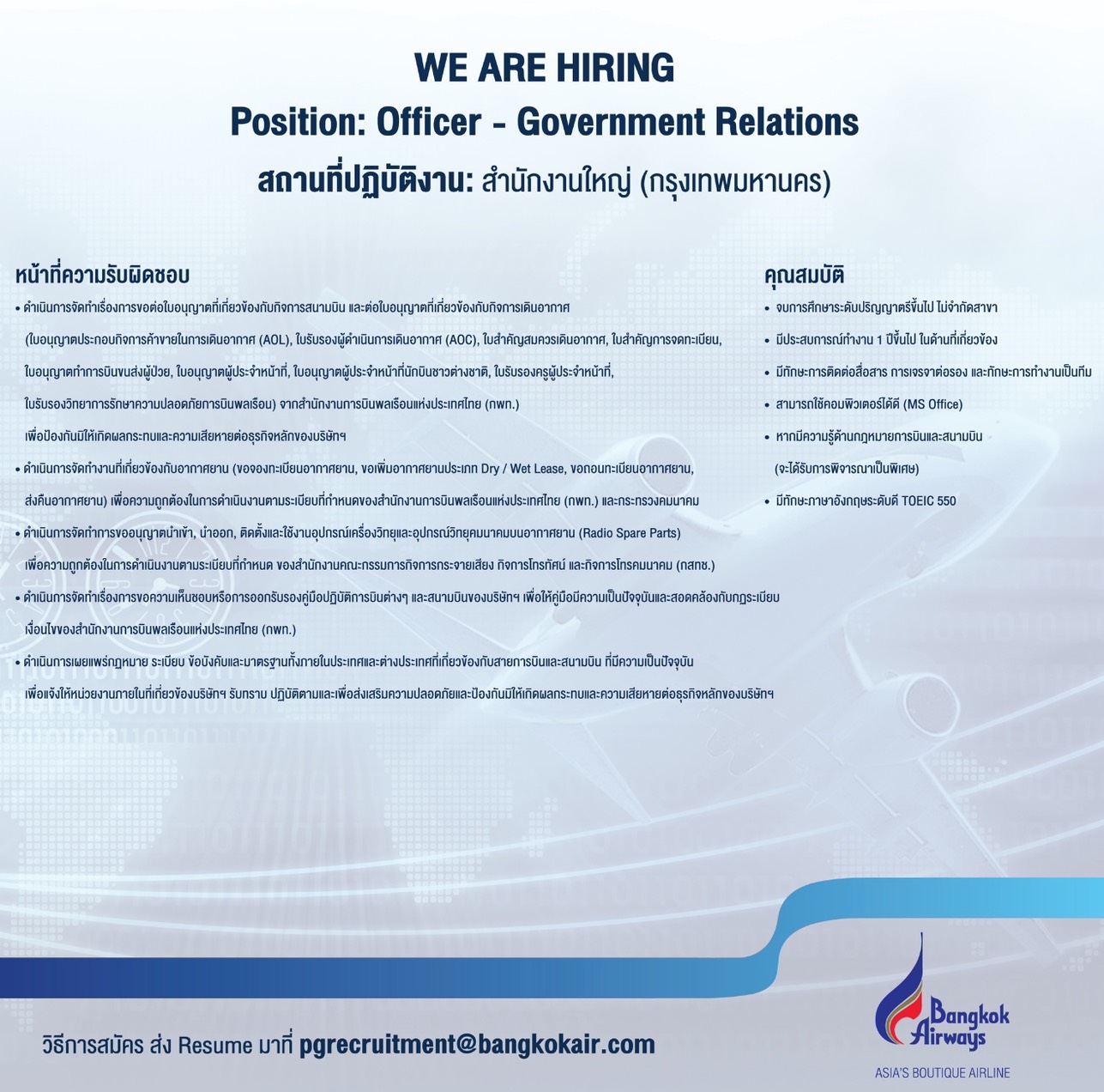สายการบิน Bangkok Airways เปิดรับสมัครตำแหน่ง Government Relations Officer วุฒิ ป.ตรี ทุกสาขา มีประสบการณ์ 1 ปีขึ้นไปในงานที่เกี่ยวข้อง ใช้งาน MS Office ได้เป็นอย่างดี ขอ TOEIC 550 คะแนนขึ้นไป ทำงานที่สำนักงานใหญ่