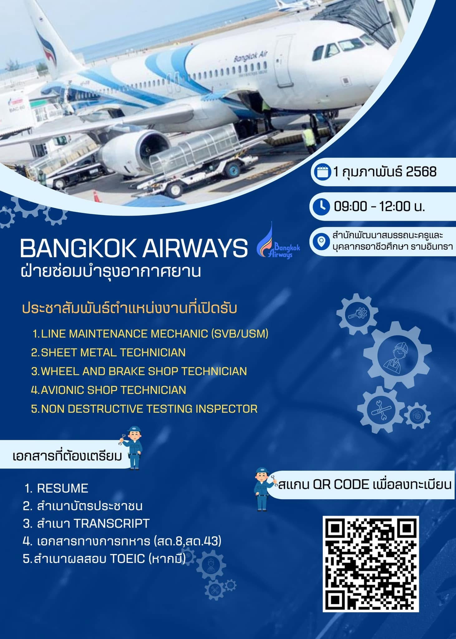 สายการบิน Bangkok Airways เปิดรับสมัครฝ่ายซ่อมบำรุงอากาศยาน 5 ตำแหน่ง วันที่ 1 กุมภาพันธ์ เวลา 09.00-12.00 น. ที่สำนักพัฒนาสมรรถนะครูและบุคลากรอาชีวศึกษา