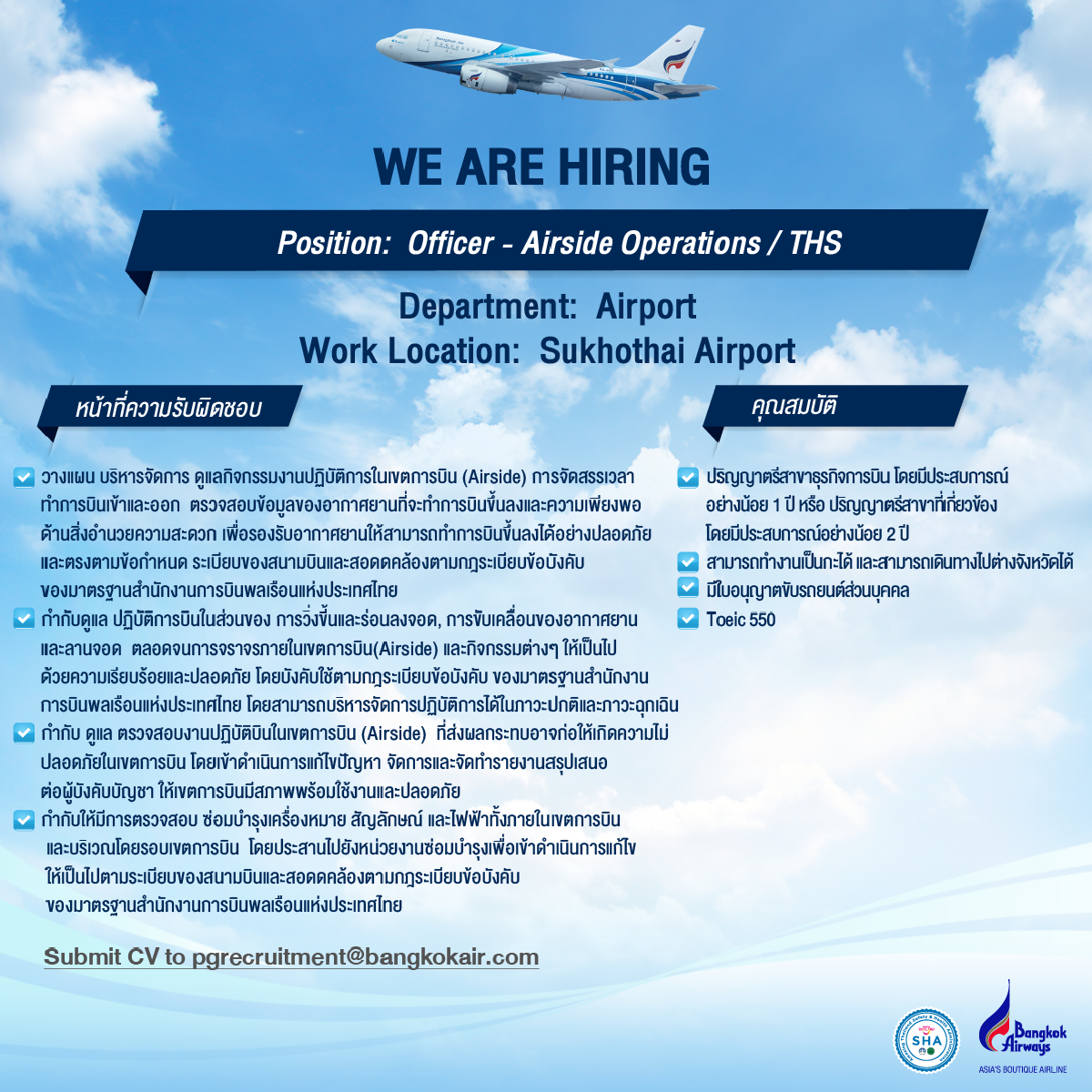 สายการบิน Bangkok Airways เปิดรับสมัครตำแหน่ง Airside Operations Officer วุฒิ ป.ตรี ขอ TOEIC 550 คะแนนขึ้นไป ทำงานที่สนามบินสุโขทัย