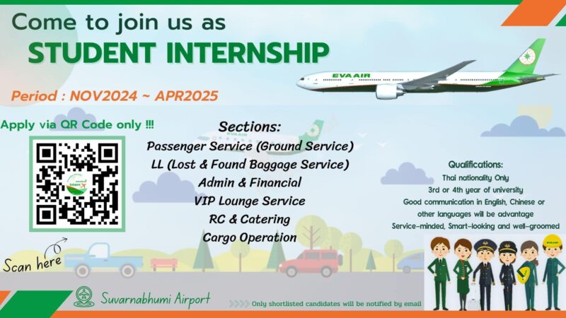 น้องๆนักศึกษาที่กำลังมองหาที่ฝึกงาน ตอนนี้สายการบิน EVA Air เปิดรับสมัครนักศึกษาฝึกงาน ชั้นปีที่ 3 และปีที่ 4 รับทั้งหมด 6 ตำแหน่ง ที่สนามบินสุวรรณภูมิ ฝึกช่วง พ.ย. 67 – เม.ย. 68