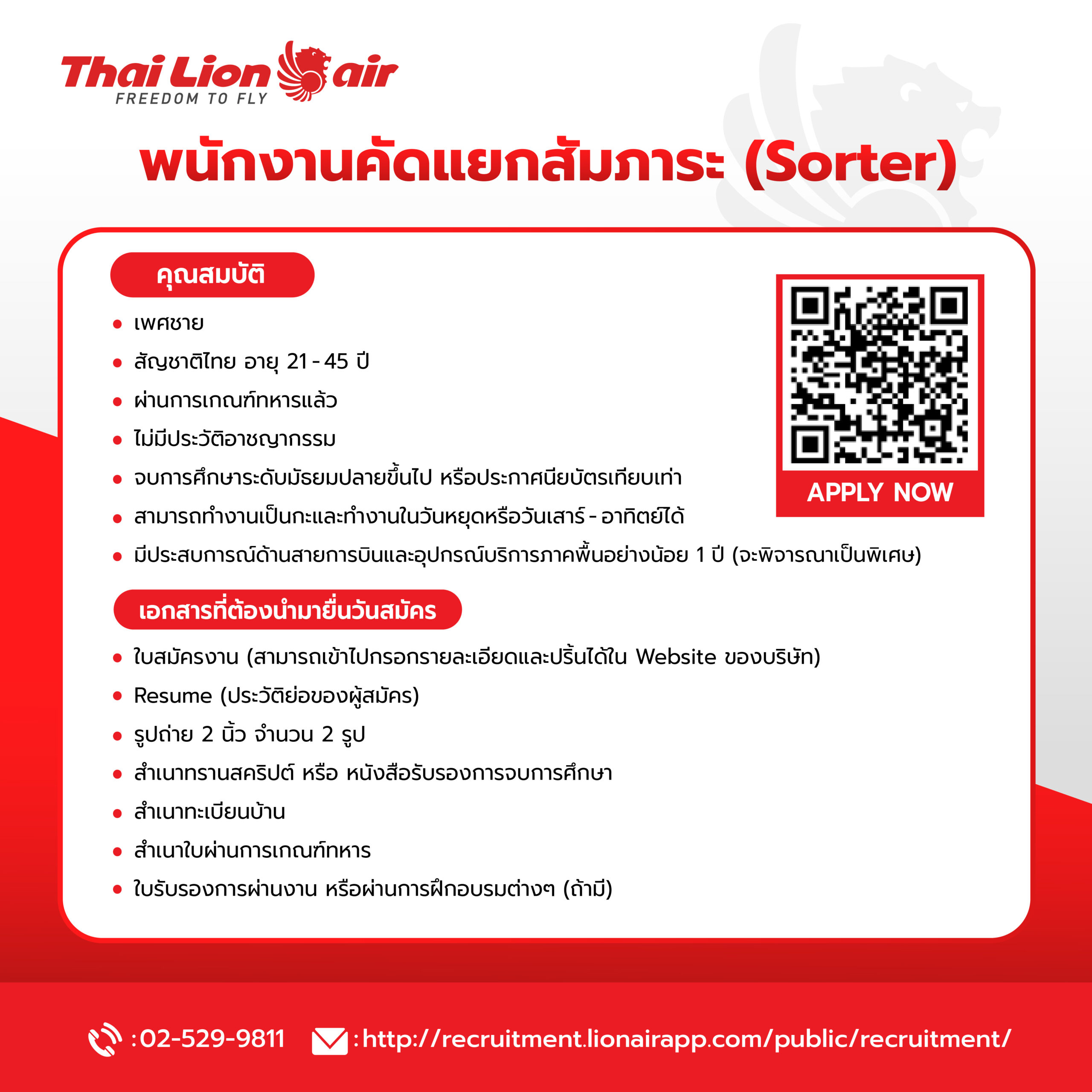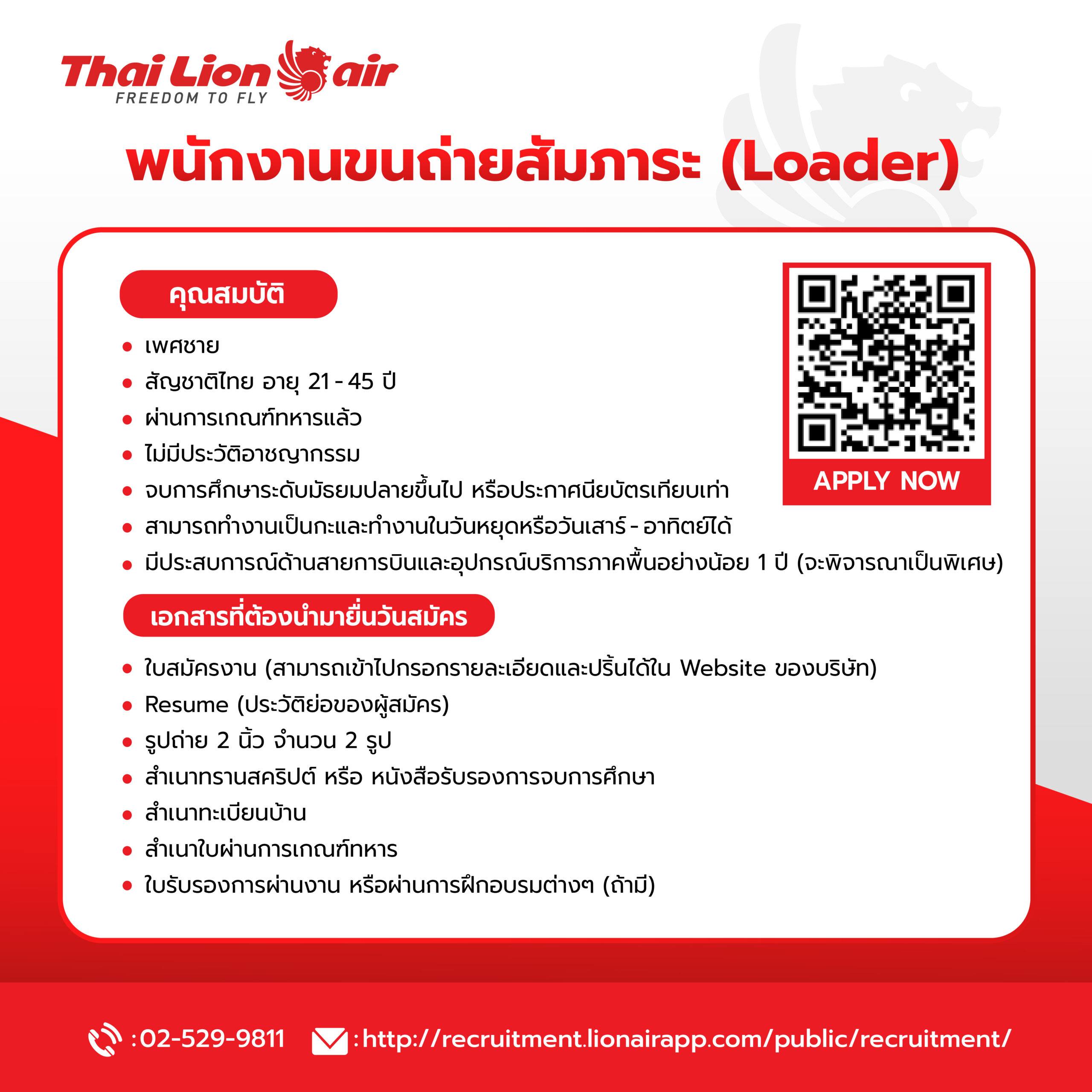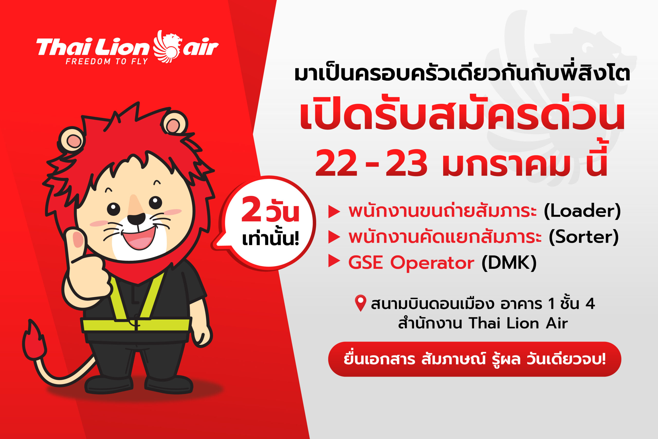 Thai Lion Air รับสมัคร 3 ตำแหน่งด่วน วันที่ 22-23 มกราคมนี้