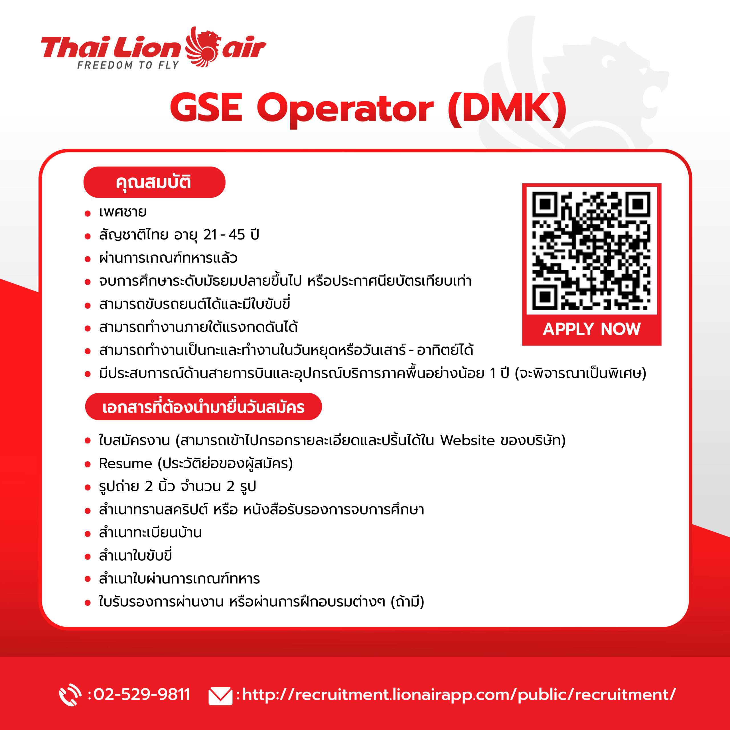 สายการบิน Thai Lion Air เปิดรับสมัครตำแหน่ง GSE Operator / Loader / Sorter สมัครได้ที่อาคาร 1 ชั้น 4 สำนักงาน Thai Lion Air สนามบินดอนเมือง วันที่ 22-23 มกราคม ดูรายละเอียดคุณสมบัติแต่ละตำแหน่งได้ที่รูปด้านล่าง